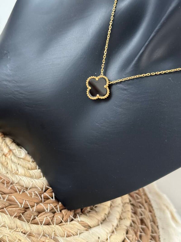 Collier chaîne fine motif trèfle noir brillant. En acier inoxydable. De couleur doré, possible d'ajuster la taille