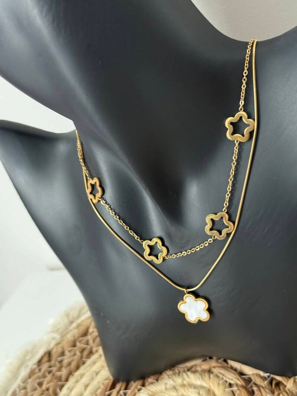 Collier chaîne 2 en 1 plusieurs étoiles sur la première chaîne sur la deuxième chaîne fine étoile blanche effet marbre. En acier inoxydable. De couleur doré, possible d'ajuster la taille
