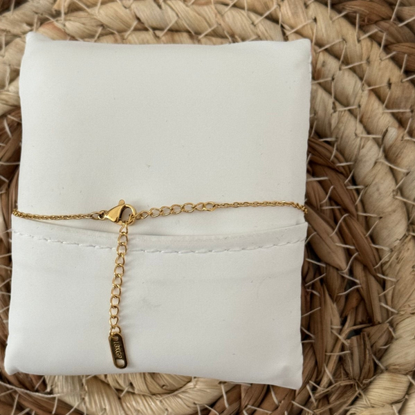 Bracelet trèfle rose, accompagné de sa chaîne fine.