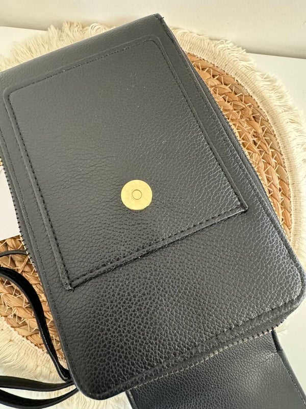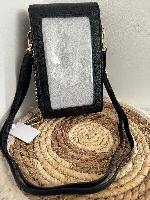 Sacoche rectangle avec plusieurs rangement,petite sangle derrière la pochette c'est pour ranger le téléphone possible d'utiliser un écran tactile